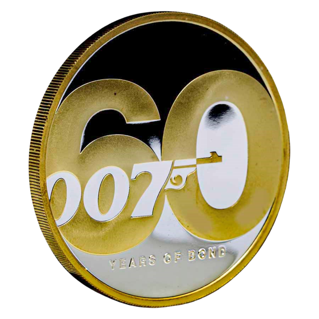 | Reverse: | “60 YEARS OF BOND” gilded logo with iconic 007 gun symbol; 24K gilded rim and edges |
