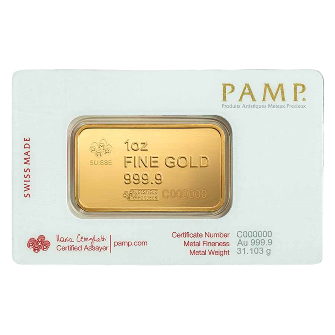 - ✓ Obverse: PAMP Suisse logo, weight, purity, serial, and Essayeur Fondeur stamp