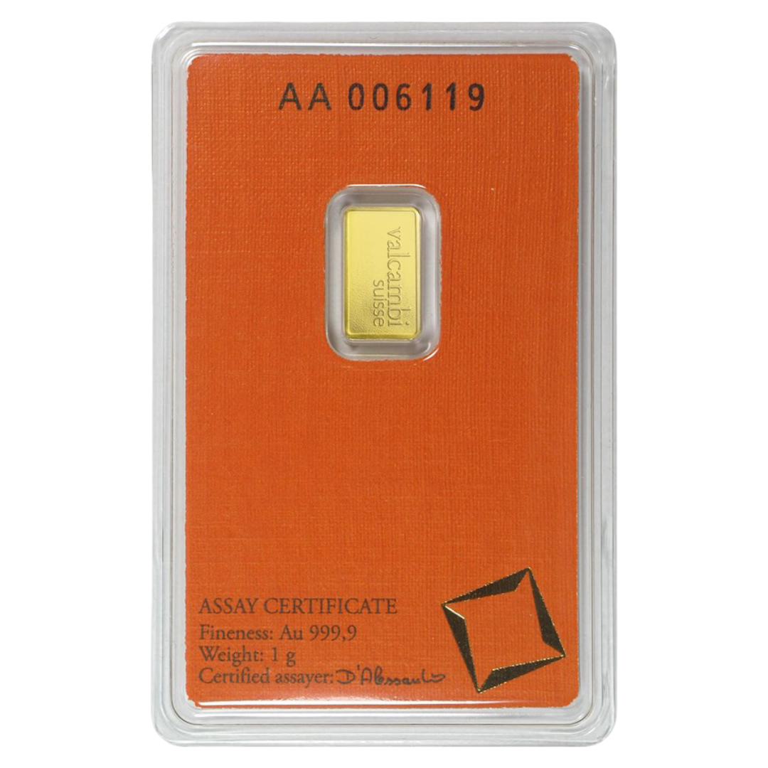 Note: Assay card color and layout may vary by production. Each bar is guaranteed for purity and weight by Valcambi Suisse and sealed in its original tamper-evident assay packaging.