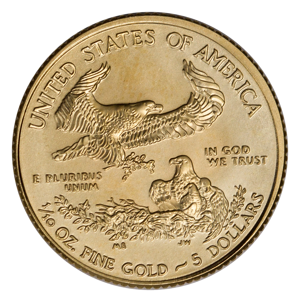 First introduced in 1986, the American Gold Eagle is the official gold bullion coin of the United States. The $5 denomination 1/10 oz Gold Eagle is the most accessible size in the series, delivering the same government guarantee, iconic artistry, and trusted liquidity as the larger denominations — in a convenient fractional format.