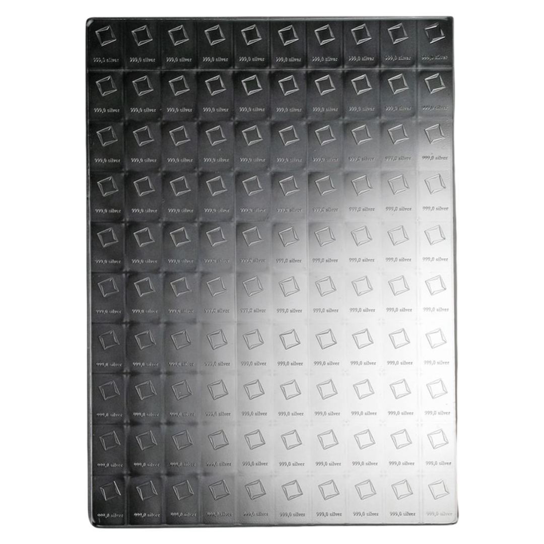 The 100 x 1 gram Silver Valcambi CombiBar™ offers a unique blend of flexibility and efficiency. Struck from 100 grams of .999 fine silver, this bar is designed as a single sheet that can remain intact or be easily broken into 100 individual 1 gram bars, each with its own hallmark and fineness.