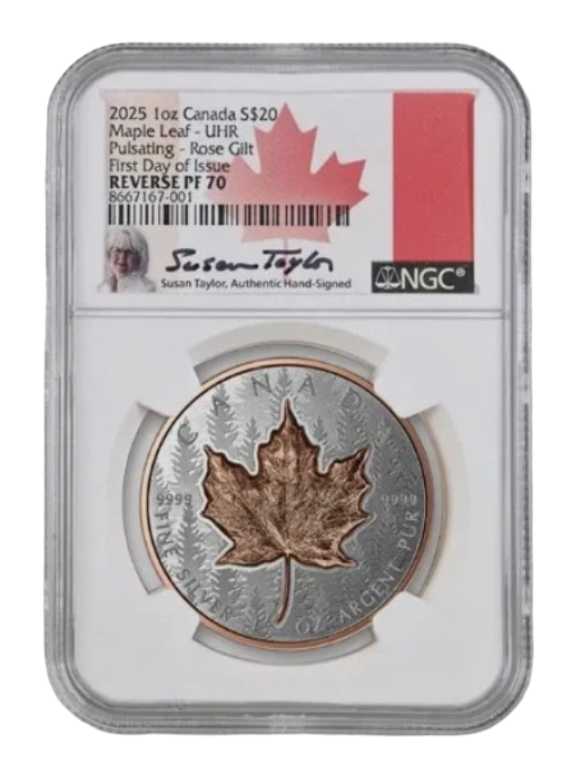 Each coin is graded a perfect Reverse PF70 by NGC and certified First Day of Issue. It bears the authentic hand signature of Susan Taylor, former Senior Engraver at the Royal Canadian Mint and designer of numerous celebrated coin series. With only 760 coins worldwide achieving a perfect grade, this masterpiece belongs among the world’s most exclusive modern proofs. Limited to 8,500 total struck, the 2025 issue continues the Maple Leaf’s legacy in remarkable fashion — now available only to MintBuilder VIP Members.